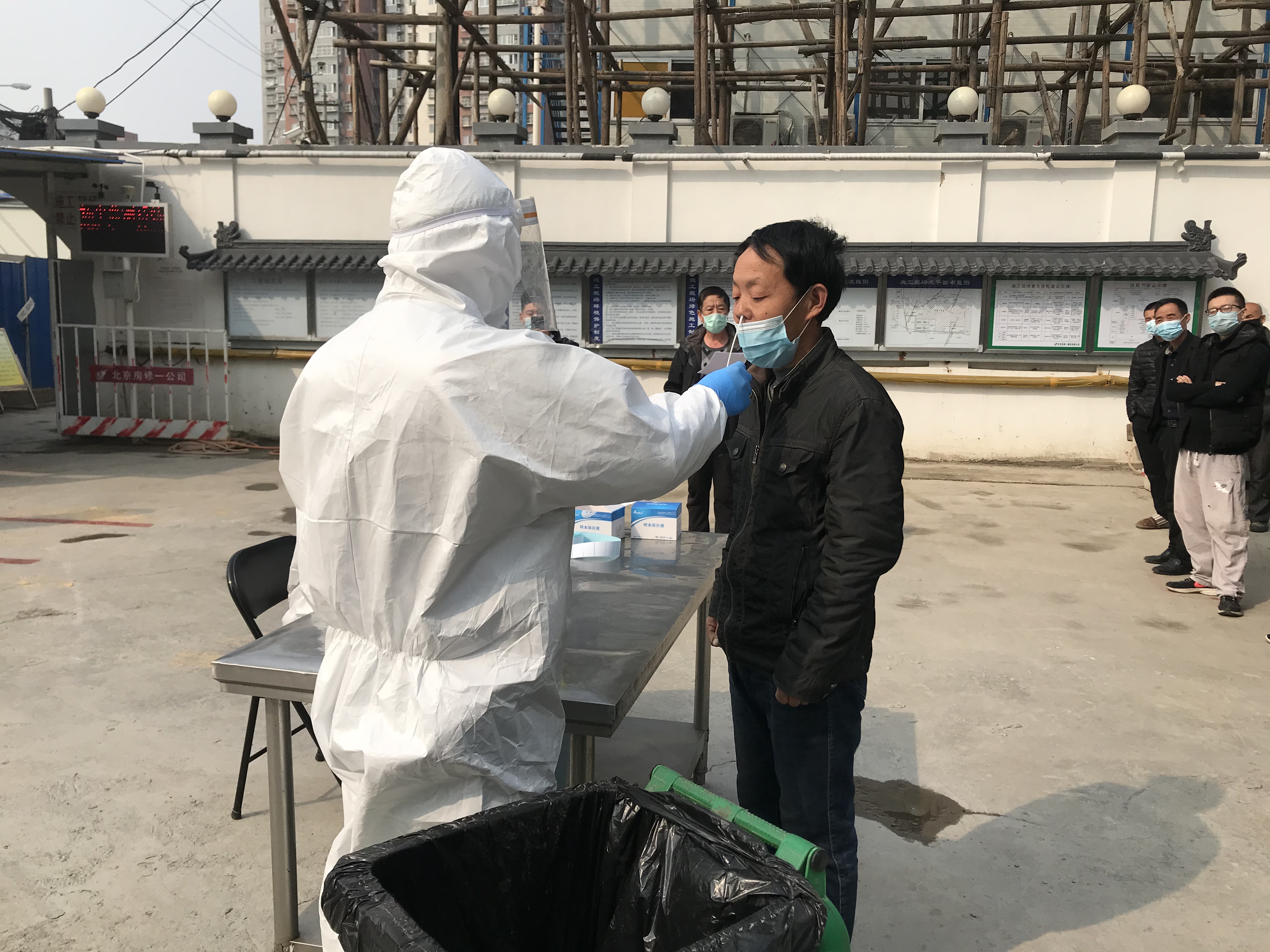 按照“外防輸入、內(nèi)防擴散”的原則,施工現(xiàn)場實行封閉式管理,隔離觀察人員的一日三餐由項目部從有資質(zhì)的餐飲企業(yè)訂購發(fā)放。每天由專職衛(wèi)生員對返京勞務(wù)人員進行2次體溫監(jiān)測、對隔離觀察區(qū)域進行2次消殺,宿舍每天2次不少于30分鐘的通風(fēng)并做好記錄。按照朝陽區(qū)建委以及甲方的要求,項目部于3月31日聘請了防疫專業(yè)人員對所有返京隔離人員進行鼻咽拭子檢測,檢測結(jié)果均為正常。